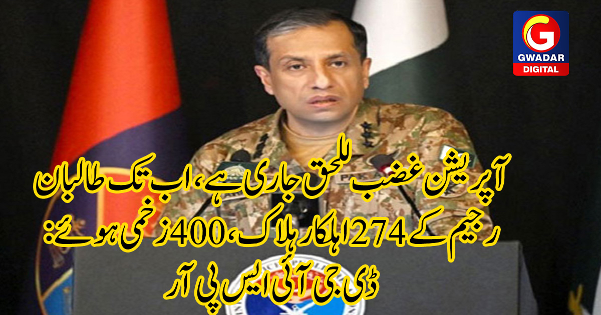 ڈی جی آئی ایس پی آر نے کہا کہ آپریشن غضب للحق میں 274 طالبان رجیم کے اہلکار اور خوارج ہلاک، جبکہ 400 سے زائد زخمی ہوئے۔